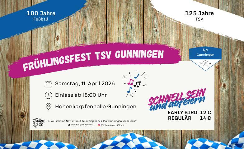 Der TSV Gunningen feiert sein 125-jähriges Jubiläum und ihr seid herzlich eingeladen! Freut euch auf ein unvergessliches Frühlingsfest mit bester Stimmung, toller Musik und einer prall gefüllten Festhalle.